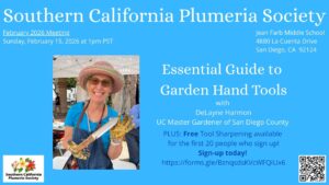 DeLayne Harmon is a UC Master Gardener of San Diego County with over 4,000 hours of volunteer service since becoming an MG in 2020. She is the current chair of the Tool Care Committee. Her presentation, the Essential Guide to Garden Hand Tools, covers how to select, care for and use various garden hand tools including planters, diggers, weeders, the ergonomics of tool usage, tool selection and a short ‘how-to’ on caring for your tools. As a career educator, DeLayne is an energetic and informative speaker who loves to share her love of gardening, and her knowledge of some of the tools we use to make the job safer and even more enjoyable.